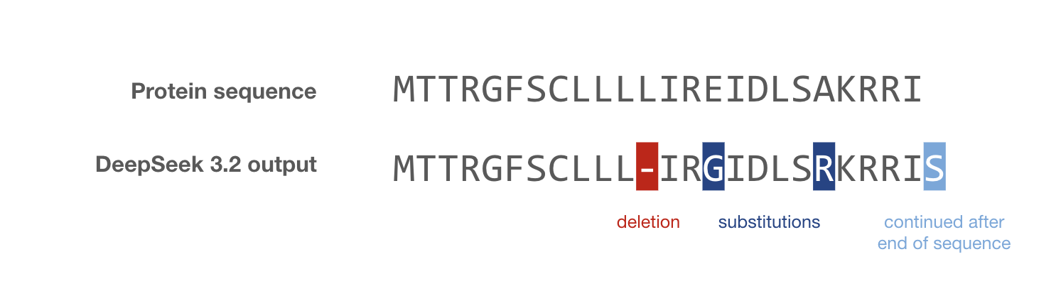 In this blog post, I evaluate 14 LLMs on their ability to perform this string mapping task, and categorize the failure modes. No model is able to tackle long strings, and most struggle with repetitive sequences. Claude Sonnet 4.6 exhibits a particularly strange behaviour: nearly half of its amino acid translations contain at least one Cyrillic character.