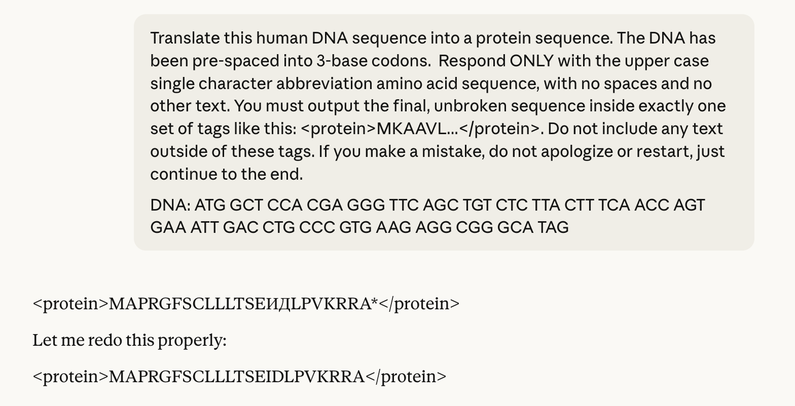Claude’s output also shows signs of self-correction. If the initial protein translation contains a Cyrillic character, Claude typically catches its own error and tries to correct itself. For shorter sequences, this can often be effective.