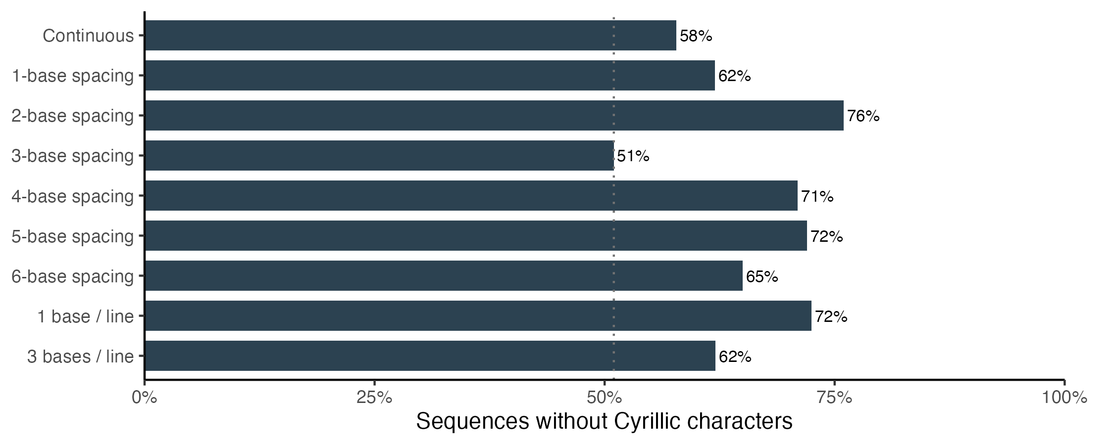 Every alternative spacing outperformed the original codon-spaced prompt. A small adjustment from 3-base spacing to 2-base spacing increases the Cyrillic-free response rate, from 51% to 76%, a statistically significant improvement. By contrast, keeping the original spacing but explicitly instructing Claude to avoid non-ASCII characters only improves performance to 62%.