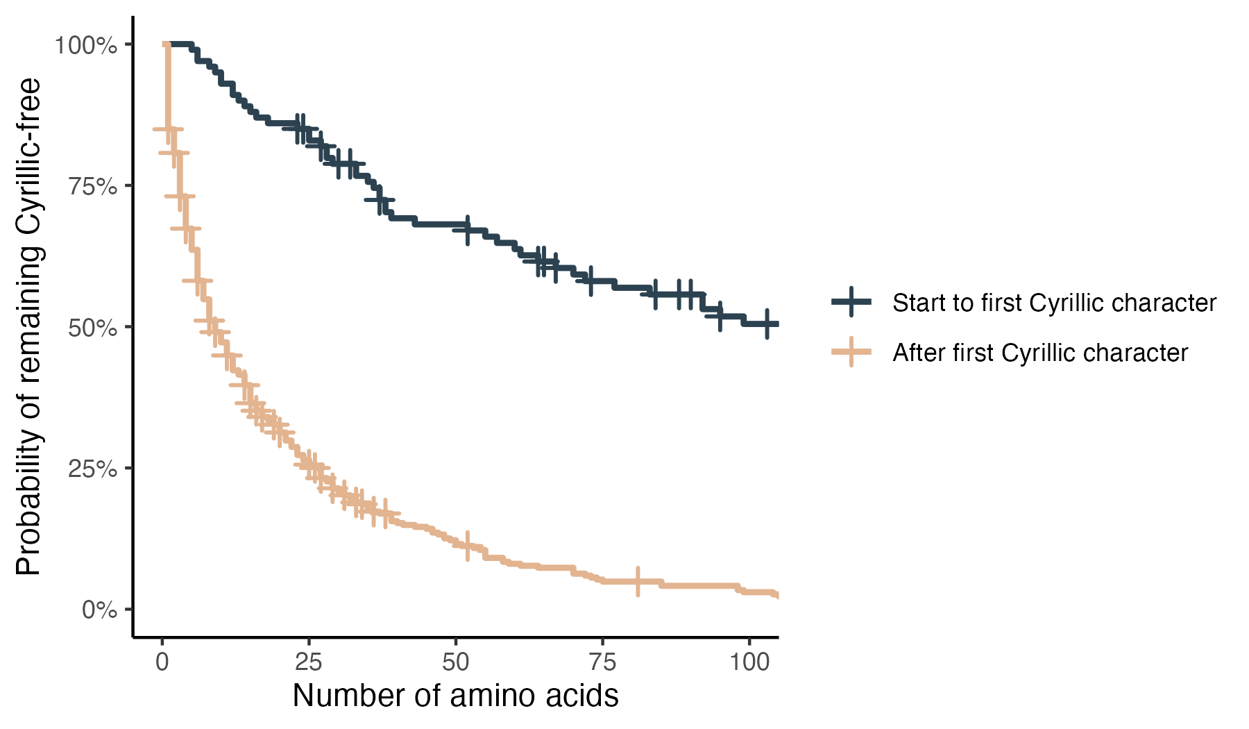 Once the model emits its first Cyrillic character, subsequent Cyrillic characters become much more likely, but the model rarely switches completely.