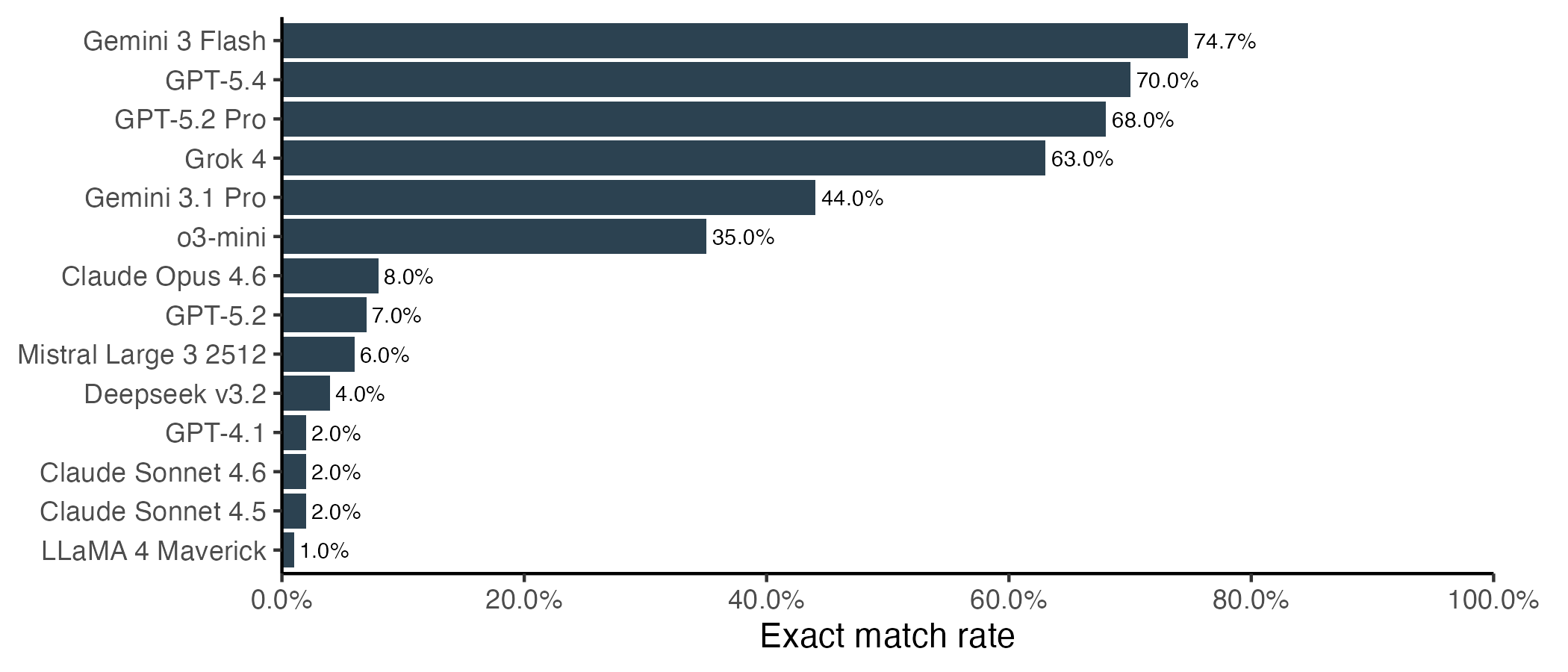 Let’s start with the correctness question. Somewhat surprisingly, Gemini 3 Flash did the best overall, with 75% of sequences being an exact match to the correct protein. This narrowly beat the top OpenAI models, and considerably outperformed Gemini 3.1. Another surprising overachiever was Grok 4.